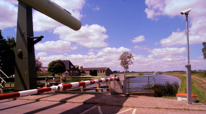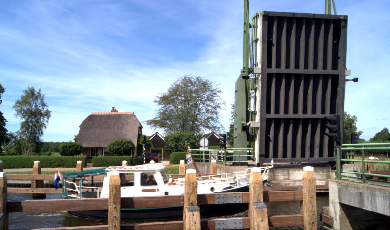 Na zo'n 10 km fietsen door een landschappelijk bosgebied, komen we bij de brug over het kanaal Steenwijk-Ossenzijl. En ja hoor weer staat de brug omhoog. Veel pleziervaart vandaag.