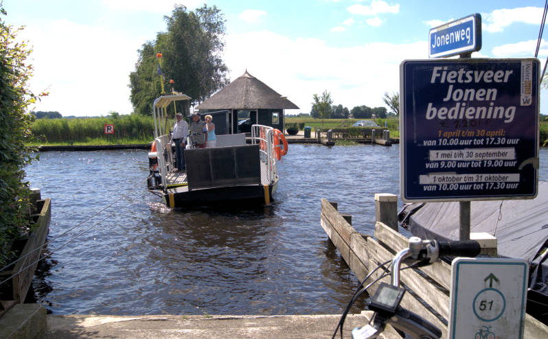 Als we door de drukte in Dwarsgracht zijn, fietsen we naar het pontje in Jonen, waar we het water oversteken richting Blokzijl.