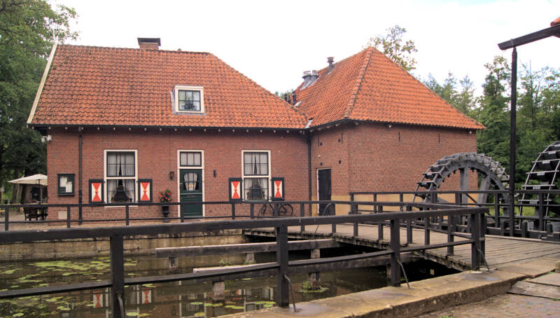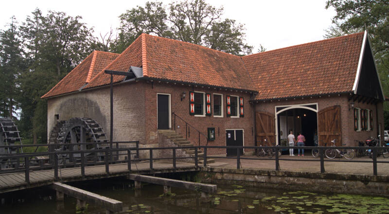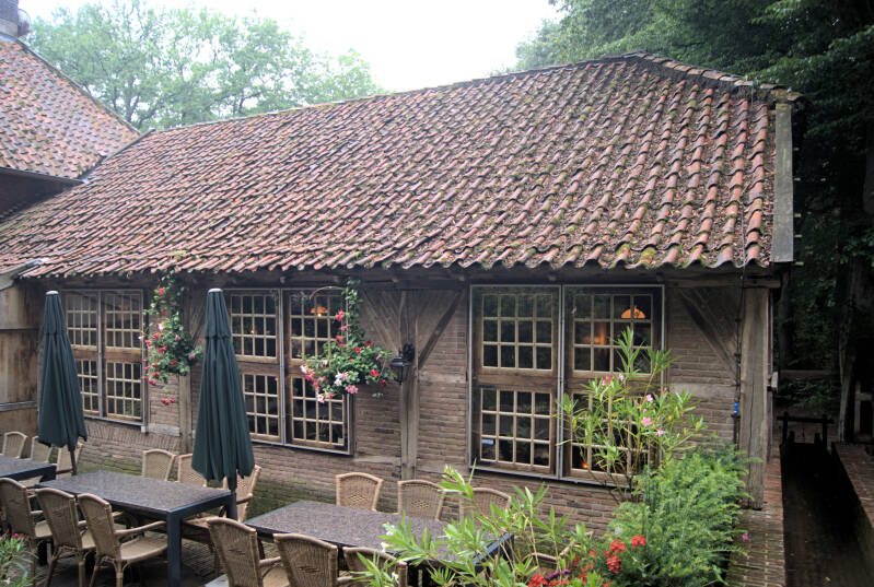 In een gebouw van de watermolen is ook een restaurant gevestigd. Op de foto duidelijk zichtbaar, de twee grote schoenraderen.
