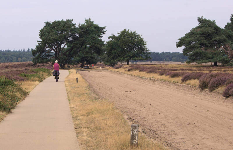 Fietsen over mooie verharde fietspaden langs de deels bloeiende heidevelden.