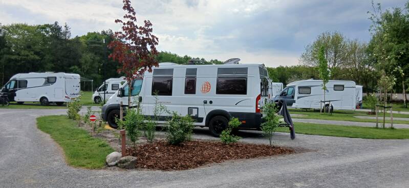 Impressie van het camperpark, met z'n ruime door gras omzoomde plaatsen.