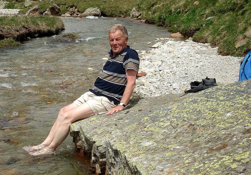 Ondanks het lopen in op goede bergschoenen, doen mij na een paar uur de tenen zeer. Dus maar even afkoelen in ijskoud smeltwater. Nadien geen last meer gehad.