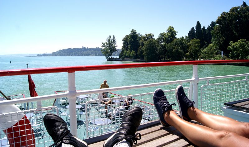 Eenmaal beneden nemen we de rondvaartboot over de Bodensee, die ons langs het eiland Mirnau naar Konstanz brengt, waar we de stad gaan bezichtigen. Op de boot is het heerlijk met een fris windje.