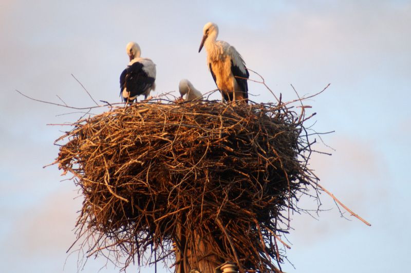 Jonge ooievaars op de nesten, direct naast de camper.