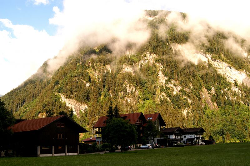 Zondag 28 juni. Vroeg in de ochtend, liggen de toppen van de bergen in de nevel. Dit door de regen van de dag ervoor.