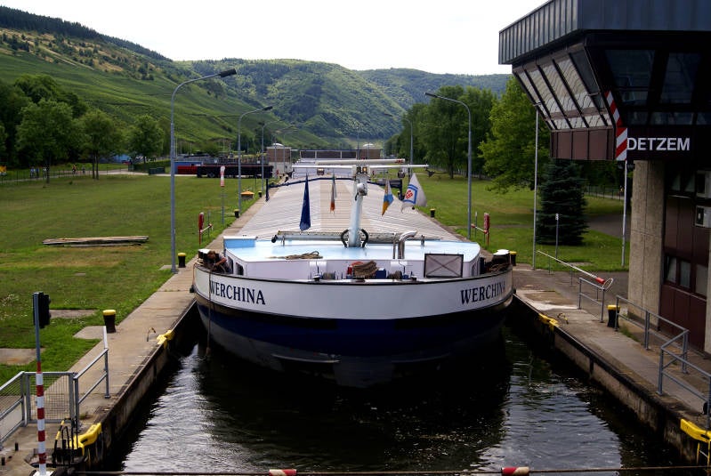 Eerst komen we onderweg een schutsluis tegen bij Detzem. Hier moet een Nederlands vrachtschip 9 m. zakken om door te kunnen varen. De Moezel heeft van begin Vogezen Frankrijk naar eind Koblenz Duitsland een lengte van 544 km. Er zijn 28 schutsluizen in gebouwd. Het verval is totaal 123 m.