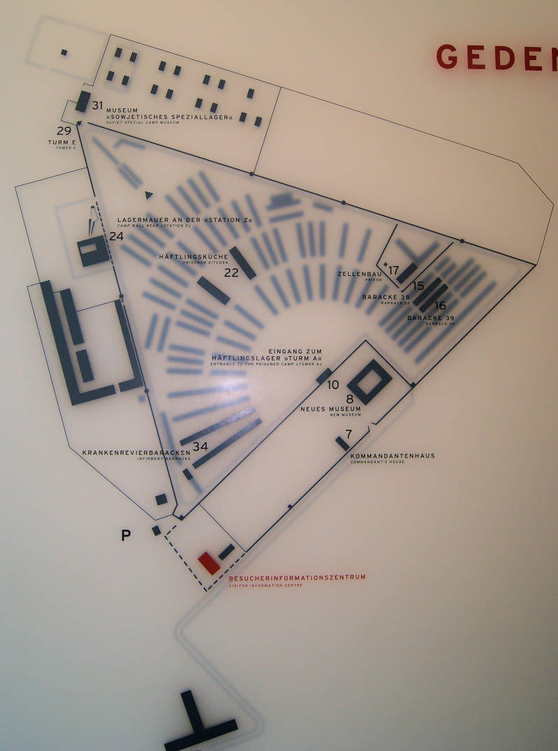 Bovenstaand: Plattegrond van het kamp in 1945. Het is dan zeker 4 keer zo groot als wat er nu van over is. Sachsenhausen was het grootse gevangenenkamp van die tijd.