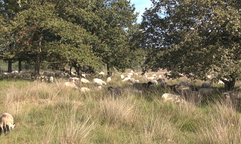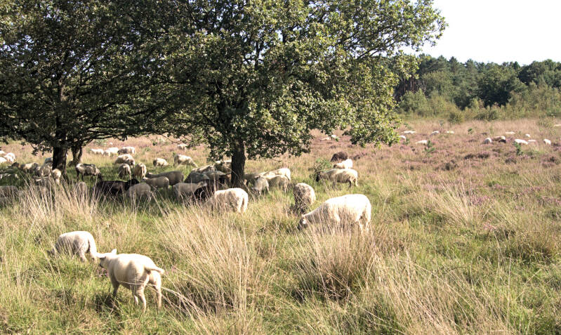 Ook de heideschapen hebben het warm op het Dwingelderveld en zoeken de schaduw van de bomen op.