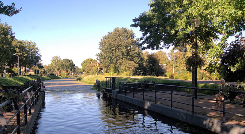 Na Hoogeveen fietsen we naar Nieuweroord, waar we even pauzeren bij het oude sluisje. Even wat eten drinken